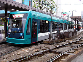 【↑ 広島駅にて。広島電鉄の連接・超低床路面電車5000形】