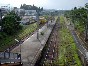 駅舎側にはホームがなく、側線が駅舎横の貨物用ホームや貨物の積み卸し場に伸びる…というのは、昔の小規模交換駅に多かった構造。ただし、今の側線には点検車が放置され、貨物用スペースだったと思われる場所は駐車場代わりの空き地に。