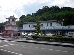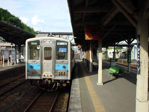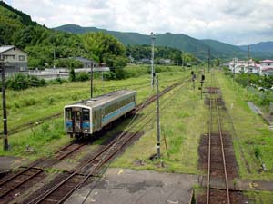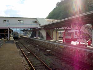 のどかな田園風景の中を走っていた列車は、田野から次の青井岳までは山越えとなり、車窓も一変する。列車速度もガクッと落ち、峠を実感させる雰囲気ですね。その谷間にチラッと見えた新築の建物が、国民宿舎・青井岳荘を改装した総合交流活性化センター(山之口町営)、青井岳温泉でしょーか。駅からは徒歩10分強ぐらいに見えましたが、残念ながら今回は時間がなく、そのまま都城へ。