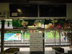 改札口に「吉松−人吉間は運休」と書かれた黒板が…。