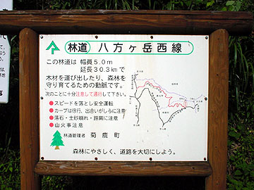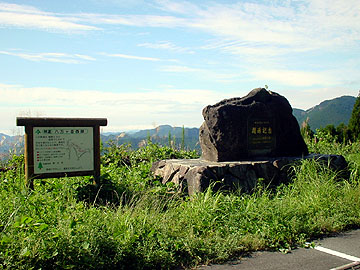 当初はこのあたりから菊鹿町、山鹿市に抜け、菊池&山鹿温泉にでも立ち寄り…と考えていたのだけれど、いくら走っても山を下りていく気配がない。と言うよりむしろ、どんどん標高が上がっていく感覚? 見渡す限り雄大な山地が広がる光景に、おかしいなぁと思いつつ走り続けると(←戻れよ)、何やら峠らしきところに到達。駐車&休憩スペースもあり、何やら石碑が建っている。“広域基幹林道・八方ヶ岳西線全通記念”とか何とか…政治家の名前まで彫ってあるし。
