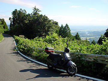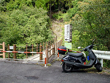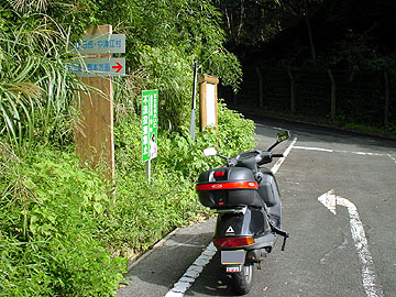 トンネルを抜けると、一気に下りワィンディングロード。全開で車体を倒し込みながらコーナーを攻めていく…って、リードでこんなことするか、ふつー(笑)? 左側はサイドスタンドのせいでバンク角が浅く、しょっちゅう路面に擦る擦る。だから、リードでバンク角を気にするかっての(^^;; 対向車? あるわけないじゃないですか。それどころか、この前クルマが通ったのは何日前? といった路面なので。