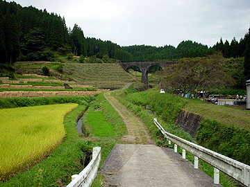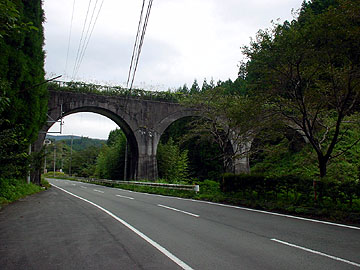 ローカル線らしい味わいで旅鉄派に人気のあった宮原線ですが、その遺構が現在も数多く残ることから、昨今の廃線跡ブームでも脚光を浴びているそう。小国(宮原)からほど近い山川温泉の周辺にも、アーチ橋が2箇所、かつてのままの姿で残っていました。当時の駅間で言うなら、北里−麻生釣間ですね。見かけはコンクリート橋でも、戦後の物資不足な時代に建造されたため、実体は鉄筋コンクリートならぬ“竹筋”コンクリートだったとか…。