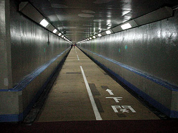 関門海底国道トンネルは二層構造で、上部が車道、下部が人(自転車・原付)道。地上からはエレベーターで降りる仕組み。エレベーターに自転車を乗せるというギミックも、何だか楽しいぞ(笑)。でも、トンネル内は自転車走行不可。なだらかな傾斜でも、距離があるだけに押して歩くのはけっこう辛い。。。一長一短ですね。