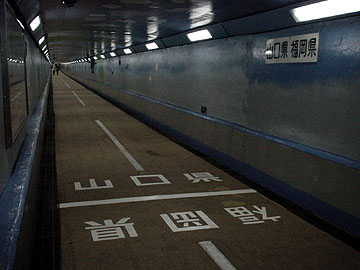 歩いている人の多さは、ちょっと予想外。誰もいない、シンとした雰囲気を想像していただけに、賑やかすぎて拍子抜けでした。大半が観光客風で、「歩いて関門海峡を渡る」面白さには観光要素も十分と言うことでしょうか。トンネルの中央部付近には白線が引かれていて、そこが山口・福岡の県境。映画『チルソクの夏』の1シーンを思い出しました。