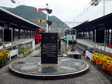 【↑ ホーム脇には実際の0kmポストと、腕木式信号機や動輪をモチーフにした0マイル記念ポストが】