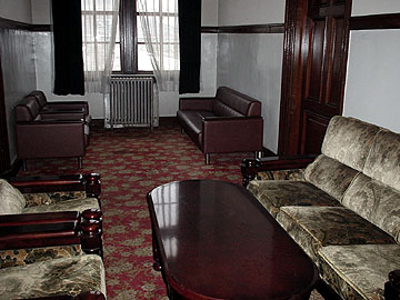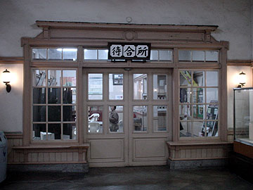 【↑ (左)駅構内の待合室。切符売場も同様に重厚な門構え (右)貴賓室。廊下から覗けるだけで立入禁止】