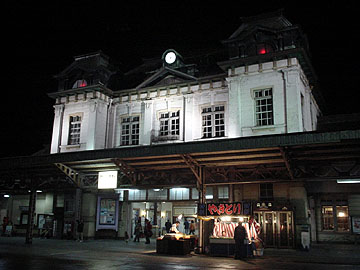 【↑ (右)夜間は駅舎全体がライトアップされる】