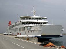 *(左・中)福田港フェリーターミナル (右)夕方、福田港で見かけた《あずき丸》。元は高松−土庄航路に就航、現在は予備船?