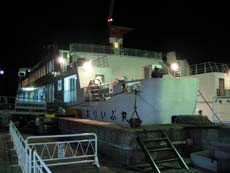 なわけで空腹に耐えつつ寂しくフェリーを待っていると、轟音を響かせながら大型トラックが1台、また1台と到着し、出航時間前には6〜7台に。いっぽう、この時間から姫路へ向かう人間が多いわけもなく、待合室の“乗客”は自分一人。先ほどのおじいさんの話からもわかるように、海上で県境を越える人の動きは多くなく、関西方面との貨物輸送がメインなんでしょうね。バスとフェリーの時刻がまったく接続していないのにも納得。そもそも福田港バス停は街並みの中にあって、フェリーとの乗り換え客などいるわけがない…といった感じ。知らない人間が夜に降りたら、どこがフェリーターミナルなのかわからないでしょう。