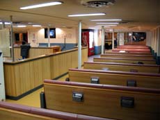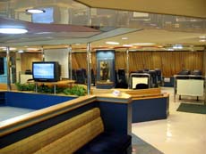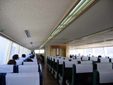 ちなみに、クルマなしの乗客は下船客と入れ替わりに勝手に乗り込むシステムなよう。気づけばどんどんトラックが乗り込み、何やら出航準備が…慌てて係員に尋ねると「乗るの!?」。この便にクルマなしで乗り込む客など、ふだんから皆無なんでしょうねぇ。でも、初めて利用する客だっているんだから、何かしら案内ぐらいしてくれー。なわけで、出航間際の最後の乗船に(^^;; 船内客室はトラックドライバーが数人いるだけで、ほとんど無人。。。