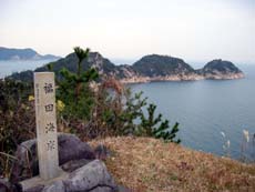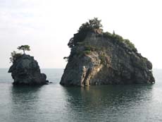 *(左)道筋で見かけた、海食地形が珍しい花寿波島(県指定自然記念物) (右)石場の記念石