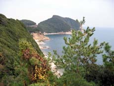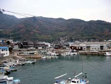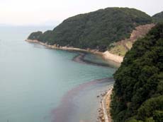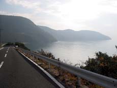 ほぼ島を半周するカタチで島北東端・福田港方面へ向かうと、それまでとは景観がだいぶ変わってくる。南側の穏やかで暖かな、ちょっとリゾート風とも言える雰囲気から、いわゆる“島”らしい、ひなびた光景が広がるようになる。その後、島の北側を走っている間も同様で、醤油造りなど地場産業があり観光地化もされている南側と、目立った観光地もなく漁業と農業の集落が点在する北側とでは、まったく趣を異にするんですねぇ。穏やかな海岸線を走っていた道路も、北東部ではときに山越えとなり、海岸線も山が海にそのまま落ち込むような険しい地形が目立ち始める。