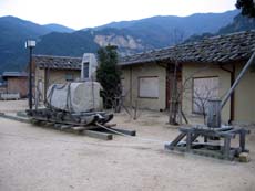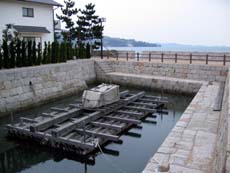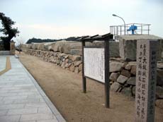 大部からさらに土庄方面へ走ると、小海集落。ここには道の駅・大阪城残石記念公園があり、かつては無造作に海辺に並べられていたという残石が、キレイに組んで展示されています。また、実際に使われていた器具を用いて、かつての石の輸送方法を再現しているのも面白いですね。併設される大阪城残石資料館が、閉館時間を過ぎていて入れなかったのは残念。