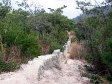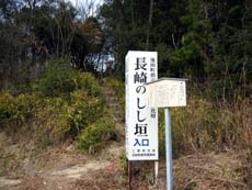 それを見ていて気になったのが、《長崎のしし垣》。しし垣とは猪や鹿、猿などから農作物を守るため、江戸時代に多く作られた垣根。石で作られたものは多いものの、ここは土で作られた珍しいもので、延長200メートル、島内最長のしし垣が当時のままの形で残っているらしい。なわけで脇道に入り、農道のような細い山道をどんどん上がっていく…ガイドマップにも載っていないし、フツー、こんなところまで来る観光客はいないんだろうなぁ(^^;;