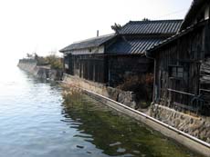 *(左)土庄町大部集落 (中)港近くの《やまひら醤油》工場 (右)大部港からは岡山県日生町とを結ぶ瀬戸内観光汽船が発着