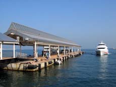 *(左)高松フェリーターミナル (中)桟橋にスーパーマリンが着岸 (右)スーパーマリン