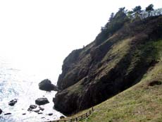 再び国道279号を大間方面へ戻る。途中、桑畑集落の小高い丘に立てられているのが、桑畑温泉の村営日帰り温泉施設《湯ん湯ん》。国道沿いに大きな看板が出ているのでわかりやすく、桑畑温泉入口のバス停もあり。廃校となった桑畑小学校の跡地だそうで、2002年12月1日のオープンだけにまだ真新しく、休憩室や浴室も明るく開放的でキレイなもの。若干白濁気味ながらほぼ無色透明、塩味で、ややぬるっとした感じがひじょうにいいお湯です。熱さも適温ですが、源泉は34度のためボイラー加熱しているそう。ガラス張りの浴室の外は展望テラスになっていて、津軽海峡が一望に見渡せる。うーん、ここはいいですねぇ。せっかくならテラス部に露天風呂も…泉温が低いからちょっと無理かな。冬は吹雪の吹きさらしになるだろーし(^^;;
