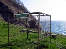 *(左)国道338号の仏ヶ浦付近 (中)駐車場にはこんな看板が… (右)駐車場のすぐ下には扉を閉ざした茶店が。営業は夏季のみ?