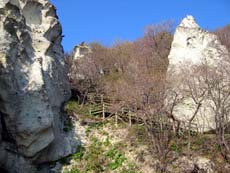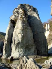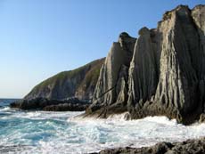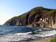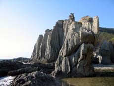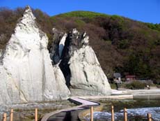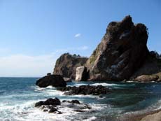 で、その仏ヶ浦は。。。確かにすごいところですねー。これは一見の価値あり、でしょう。山の緑がそのまま海に落ち込み、その先端だけが浸食による造形美を放つコントラストの異彩さ。海岸線に広がる、浸食で異様な姿となった巨岩。無人だったこともあり、しぶきをあげる津軽海峡の荒波を眺めながら、小1時間ほど孤独感に浸ってました。小さな入り江を渡り、岩をよじ登り、ちょっとした冒険気分になってみたり(^^;; 行けるところまで行ったところで潮が満ち始めたらしいのを感じ、慌てて戻りましたけど(苦笑)。陳腐な感想ですが、大自然の驚異の中で、自分がすごくちっぽけなものに感じられましたね。。。