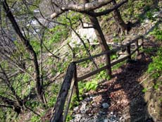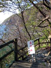 *(左)途中には「土砂崩れで通行止め」の看板が (中左)確かに、道が消えてます… (中右)新たに作られた階段 (右)海岸から降りてきた崖を見上げる