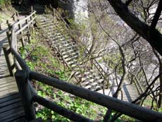 仏ヶ浦は下北半島を代表する観光スポットで、津軽海峡の荒波と風雪が海岸線の凝灰岩を削って作り上げた、一種の彫刻作品のようでもある景勝地。佐井や脇ノ沢(福浦・牛滝)から観光船が出航しているものの、今回は時間の関係で陸側から行くことに。国道から少し降りたところに駐車場とトイレが作られ、そこから海岸まで遊歩道が整備されている。って、この遊歩道がすごい。最初はダラダラと林の中を抜けていくものの、徐々に急勾配となり、後半は崖っぷちに掛けられた木製の階段で…もう、無理矢理に海岸まで降りていく感じ。その昔は船でしか行けなかった(道路からは降りられなかった)はずなので、観光客のために佐井村が整備したんでしょうね。ご苦労様です。ガイドブックには駐車場から徒歩5分などと書かれていますが、下りで10分弱、上りは15分近くかかりますねぇ。帰りの上りはかなーりキツかった…。足腰に不安がある人は船で行きませう(^^;;