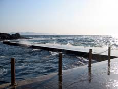 *(中)桟橋は波に洗われてます… (右)桟橋から。船を降りるとこんな風に見えるはず