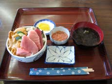 ここは、NTV『ザ!鉄腕!DASH!!』の《進め!つれたか丸》企画でも長瀬が挑戦した津軽海峡マグロ一本釣りで有名な町・大間。本当はガイドブックにも載っているマリンハウスくどうでマグロ丼を食べるつもりだったのに…周辺をブラブラして店の前に立ったのが13時5分過ぎ。玄関には“食堂は終了しました”の札がカラーン。おぃー。本州最北端の碑の付近には食堂が3軒並んでいるのだが、もう1軒もやはり営業終了。店内には客が見えたので、2軒とも13時きっかりで昼の営業は終了!? なんだかなぁ。おかげで営業中のもう1軒(実はここが“本州最北のめしや”)は満席の大繁盛。客はいずれも余所者・観光客ばかりだし、他2軒のやる気のなさには呆れましたねぇ。多忙だったに違いないGW明けで、休みたいんでしょーけど。