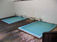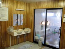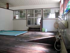 続いて、2〜3分ほど歩いてもう一つの共同浴場・大湯へ。こちらのほうが老舗で、源泉も新湯とは別(泉質は同じ)。やはり風情のある昔ながらの共同浴場で、浴槽が2つあること以外は新湯と同じような作り。で、新湯の熱さで慣れたから大丈夫だろうと浸かってみると…あちちちっっ。熱いなんてもんじゃないっす。モノの本には、大湯は源泉そのままの熱い浴槽と、少し冷ました浴槽とがあり、冷ましたほうと新湯が同じぐらいの熱さ…と書かれていたのだけれど…とてもじゃないけど浸かれません(^^;; お湯は新湯よりも濃厚でやや白濁気味…らしいけれど、あまりの熱さにそんなことを感じている余裕はナシ(味見は塩味)。そもそも、2つの浴槽とも同じ熱さじゃん。水道の蛇口はあるけれど、締められたままだし。。。入浴したのが午前10時過ぎ。朝風呂のお客さんが済んで無人の時間帯だっただけに、水が止められていたのかもしれないです。お湯を身体にかけながら何とか5秒だけ浸かってみるも、すぐに飛び出す。脱衣場で何か腕が痛いなぁと思って見てみたら、肘の部分を火傷してました(T_T)