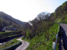 急カーブの連続にちょっと疲れてきた頃、今度はぐんぐんと下り勾配&カーブで標高が下がっていき、目の前に入り江が広がったところが福浦集落。確かに、周囲の山々と崖地を見渡しても、ここにしか人は住めませんねぇ。。。その入り江のわずかな平地に家が密集している感じの漁村にも、小中学校と簡易郵便局があるのでした。ある意味、外界から隔絶された空間でしょうから…。ここのおばちゃんは親切で、次の牛滝集落の簡易局に電話をしておいてくれると言う。時刻は既に15時過ぎ。おばちゃんによると牛滝まで45分はかかるそうで、局が閉まる16時ギリギリなんですぅー(^^;;