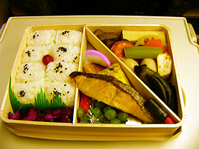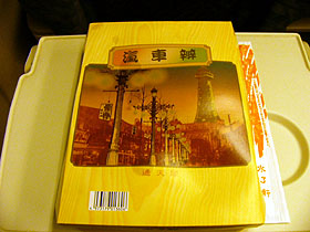 【↑ 新大阪駅で購入した駅弁、《汽車弁》。通天閣をデザインした包装がなかなか。でも中身はフツーの幕の内】
