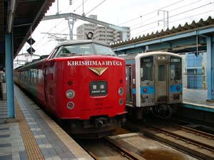 JR九州の車両は、カラフルな塗装でも話題になりがち。この日見かけた特急《ひゅうが》《きりしま》も、車両自体は今どき珍しくなった未改造&旧態依然(苦笑)の485系ながら、カラーリングだけは見栄を張ってます(^^;; 同じく485系、その新塗装から長崎本線で話題を集めた《RED EXPRESS》も、今や宮崎地区の専用車両。改めて、宮崎地区の車両近代化が遅れていることを感じさせられました。。。