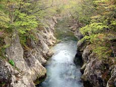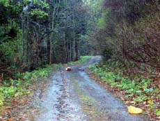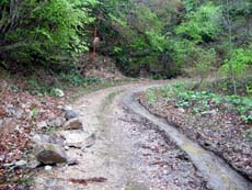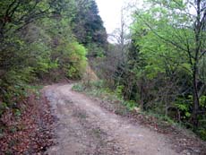 やはり、先ほどの分岐を左に行くべきじゃなかったのか…などなど、暗闇では不安ばかりが増してくる。せめて川が見えれば方向も判断でき、安心できるのだけれど、道の両側は深い林。聞こえてくる川の音だけが頼り。左側から聞こえてくる(ような気がする)ので、下流に向かっていることは確かなのだろう…。