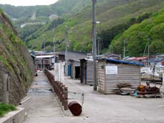 入り江の入口、集落の外れに駐車スペースや公衆トイレが作られているので、とりあえずそこにクルマを止める。いちおう案内図があったものの、半ば朽ち果てている上、イラスト的なマップで位置関係がよくわからない。。。ま、とにかく歩いてみよう。目の前の漁港に沿って歩き始めるとすぐ、入り江の最奥部から山のほうへ伸びる路地があり、そちらにも家が建ち並んでいる。どうやらそこが集落の中心部なようで、奥には小学校もあるらしい。って、路地はそれ1本しかないんですが。。。そして、漁港の中央部、入り江を最奥部からまわりこみかけたところで道がなくなっている。その先には漁師小屋のようなものが何軒か建っていて、そこを抜けると休憩所兼集会所のような建物が。さらにその先には遊歩道らしきものが延びている。