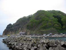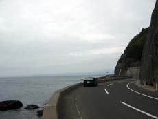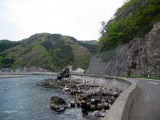 脇野沢村の中心部で国道338号と分かれ、さらに下北半島の西南端・北海岬方面へと県道175号を走る。脇野沢までの陸奥湾沿いの大人しい海岸線とは違い、津軽海峡の荒波を感じる海岸線へと景観は変貌していく。山が真っ直ぐ海に落ち込んでいるエリアだけに、崖にへばりつく道路の防潮堤は波に洗われ、頭上には崖がせり出しているような区間も。。。それでも、行き止まりの九艘泊集落まで2車線の路面が確保されているのには驚き。