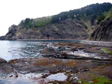 そんなこんなで海岸線を15分も歩いた頃、大きな入り江に到達。奥には水場やトイレ、バンガロー風な建物が建てられ、キャンプ場として整備されたものらしい。と言っても水は出ないし、建物も長いこと使われていないような…入り江はゴミだらけなので、人が入っていることは確か。夏場だけの営業なのかもしれません。