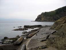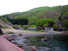 休憩所の周囲は小公園風になっていて、いつ頃なのか、いったんは観光用に整備されたことがわかる。ただし、ここにも案内板の類はなし。実はこの小公園のすぐ先(上の右写真の突端部)が下北半島の最西端・北海岬で、小公園から崖を登った上には《北海岬展望台》もあるらしい…とうのは、後ほど脇野沢のフェリー乗り場でパンフレットを見てわかったこと。現地には何の案内図も表示もなく、展望台への道も気づかなかったんですけど。。。休憩所と書かれた建物は施錠されていて入れないし、もう長いこと使われていないよう。他にはパンフレットを置くような場所もないのだから、せめて案内図ぐらいは設置して欲しいなぁ。