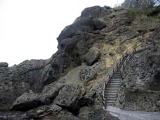 と。その入り江の先端まで来たところで…突然。と言う感じで、道がなくなった。小さな岬のような正面は岩場で阻まれ、前に進めない。岩をよじ登って見てみると、そこから先は仏ヶ浦で見たような海岸線が延びていて、岩場には荒波が打ち付けている。確かに、前に進むのは危険だ。。。で、横の絶壁には階段が掛けられている。ここを登れってか…。