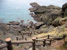 崖地のわずかな隙間を縫って掛けられた木製階段は、一部が砂に埋もれて足場がない。気分はロッククライミングですねぇ。それでも何とか登りきると、わずかな平地に雑木林が広がっている。その先には木組みの展望台があり、道はそこでおしまい。これが北海岬展望台か…と思い込み、景色を眺めてみるも、曇り空でよくわからない。うーん。。。何か釈然としないまま、来た道をまたとぼとぼと引き返していきました。