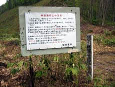 周囲を見回すと、道端に《ヒバ実験林》と書かれた標柱が建っている。この《実験林》とは、どちらの方向を示しているの!? 前方が奥薬研(大畑方面)なら、そちらから来た車が右に曲がり、川を渡ってヒバ実験林に入っていく…と考えれば、新しい橋と立派な林道にも納得できる。もはや冷静ではない頭をグルグルと巡らしつつ、真っ直ぐ前方へと歩みを進めることに。