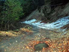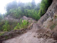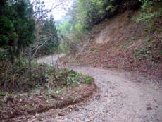 さらに林道の分岐点。「ホントにこっち? よく間違えなかったねー」。はい…。ヘッドライトに照らし出された路面を見ると、落石がゴロゴロ、路肩は崩壊、斜面は土砂崩れだらけ…。「久々に来たけど、ここまでひどいのは初めてだな。こりゃ、雪解けしたまま何の整備もしてないな」。そ、そうなんですか。