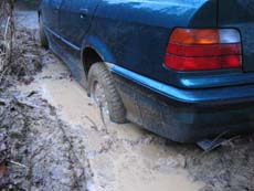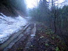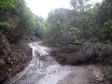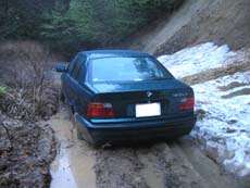 「雪解け後に何の整備もしていない状態」とはいうものの、数台のクルマが通った形跡はありました。この時期は地元の車も通らないとのことなので、GW期間中に、他所から来た四駆がアタックしたのかもしれません。そこで掘れてしまった轍が、雨で泥田状態にまで悪化していたのでしょう。そこまで考慮すべきでした。