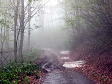 *(左)標高が上がると地質が粘土質に変わってきた。ズルズル滑る (中)峠付近では霧も。峠を越えると、林道の名称が「湯ノ川林道」から「鍋滝林道」に変わるらしい。どちらにしても、道中に道標などは一切なし (右)峠を越えると道が良くなった(^o^)