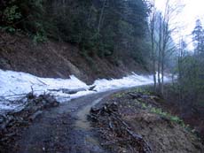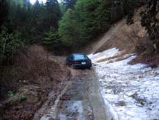 *(左)と思ったのもつかの間… (中)→(右)残雪。路面はぬかるみ。轍にハマッてスタックしかけるが何とか乗り切る