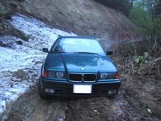 どうも路面がぬかるんでいるよう。左は崖、右は30センチほどの積雪が固まっているので乗り上げられず、通過スペースは1台分しかない。だいぶ暗くなってきて路面の細かい状況はよく見えない…多少ズルズルしながら進んでいくと、道が左にカーブ。その先の路面が見えた途端…げ、完全に沼地化してる…轍を避けられない…と思ったときには既に前輪は通過し、後輪のグリップがなくなる感覚…うわー、なんとか抜けてくれ…ギュルギュル、ズブズブ…ダメだ。。。
