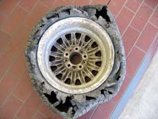 クルマを停めて確認すると、左後輪が見事なほどバースト。拳大から頭ほどもある落石がゴロゴロしている暗闇で、タイヤの角を石にぶつけたらしい。気づかずに数百メートルほど走ってしまったため、タイヤが完全に裂けていました。