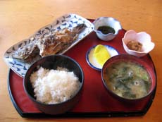 (右)脇野沢の特産・黒そいの焼魚定食(\1,500)。激うま!! 身体が冷えていたので焼き魚にしたけれど、刺身定食も食べたかった…
