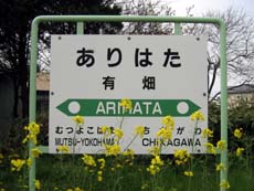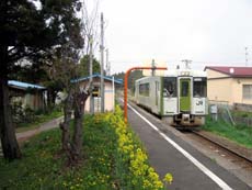 *JR大湊線・有畑駅は、集落の裏路地の奥にひっそりと佇む無人駅。ホームの菜の花が満開。
