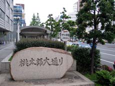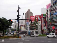 *(左)駅前通り。正面は岡山電気軌道の乗り場 (中)電停側から岡山駅を望む (右)駅前通りの名称は《桃太郎大通り》