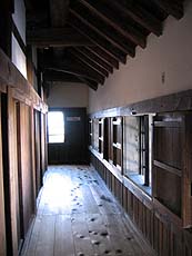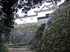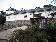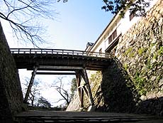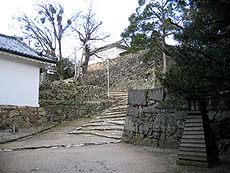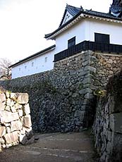 急坂を登り切ったところで表門から登ってくる石段と合流、すぐに天秤櫓をくぐる。豊臣秀吉が長浜城大手門を移築したと言われる櫓で、天秤のような形をしていることからそう呼ばれるようになったとか。こうした構造は国内城郭では唯一のものらしい。
